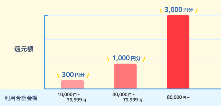 各利用対象期間のそれぞれの利用合計金額(税込)に応じて、下記割引分のお買い物ポイントを進呈いたします。