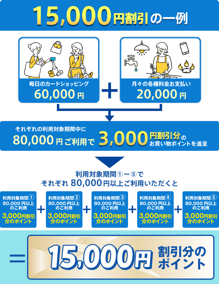 各利用対象期間中のカードショッピングご利用合計金額(税込)に応じて、最大15,000円分割引のお買い物ポイントを進呈いたします。