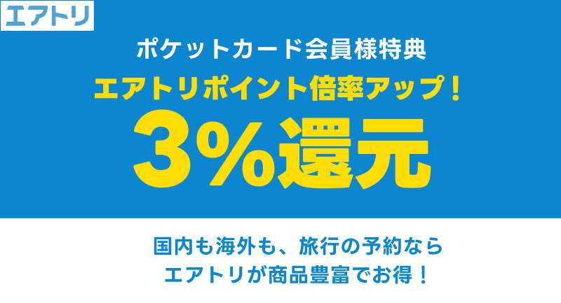 ●ポケットカード(株)発行の対象のクレジットカードでお支払いください。●本優待のエアトリポイント「3%還元」は、通常のポイントを含んでいます。