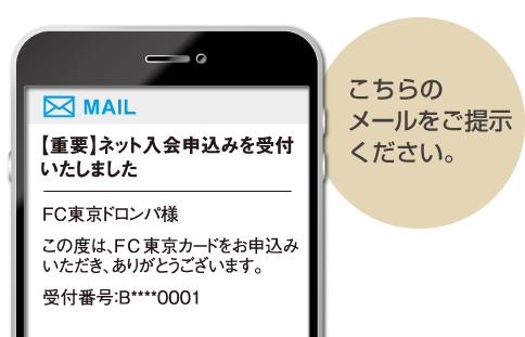 カードお申込み対象期間中にFC東京カードをお申込みのうえ、2025年9月28日(日)出展の特設ブースにお越しいただき、スタッフに「申込完了メール」をご提示ください。※「申込完了メール」は、カードお申込み完了時に配信いたします。