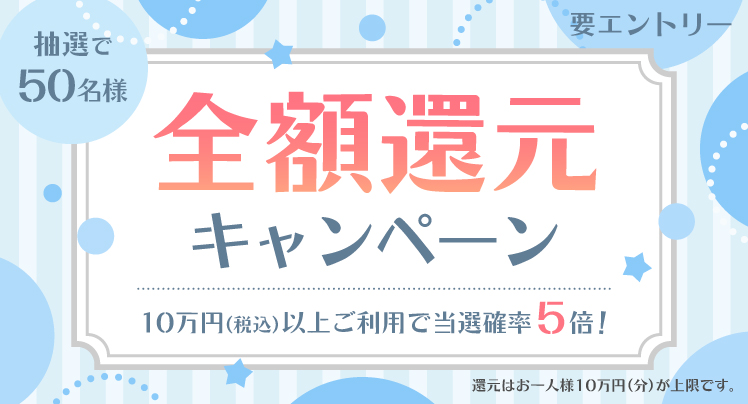 期間中にエントリーのうえ、キャンペーン対象カードでクレジット払いを合計50,000円以上(税込)ご利用いただいた会員様の中から抽選で当選金額をキャッシュバックいたします。 2025年12月1日(月)〜2026年1月31(土)