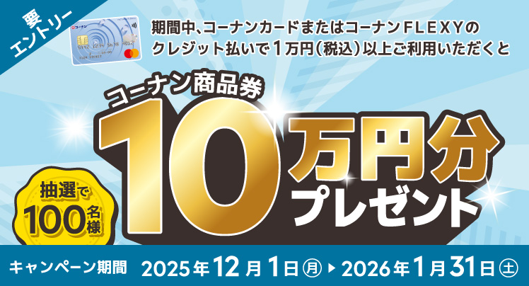 期間中にエントリーのうえ、コーナンカードまたはコーナンFLEXYでクレジット払いをご利用いただくと、期間中のクレジット払いご利用合計金額10,000円(税込)を1口として抽選で100名様に、10万円分のコーナン商品券をプレゼントいたします。★コーナン店舗で10,000円(税込)以上のご利用がある方は、累計口数が2倍になります!★ 2025年12月1日(月)〜2026年1月31日(土)