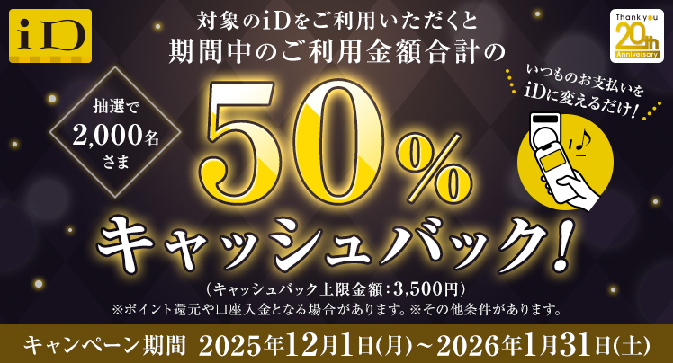 キャンペーン期間中に「1回100円(税込)以上」iDをご利用いただいた方の中から、抽選で2,000名さまに期間中のご利用金額合計の50%分をキャッシュバックいたします。