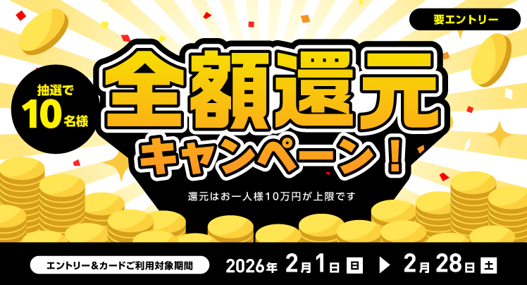 期間中にエントリーのうえ、キャンペーン対象カードでクレジット払いをご利用いただいた会員様の中から抽選で、10名様に期間中のショッピングご利用合計金額を全額還元いたします。 2026年2月1日(日)〜2026年2月28日(土)
