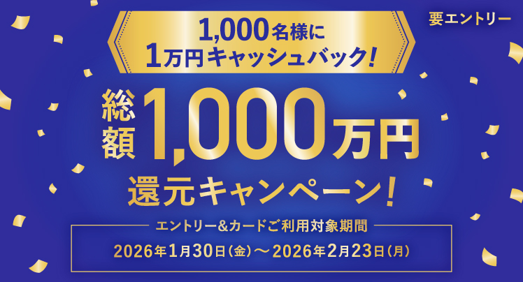 期間中にエントリーのうえ、キャンペーン対象カードでクレジット払いを合計5,000円以上(税込)ご利用いただいた方の会員様から抽選で、1,000名様に10,000円をキャッシュバックいたします。 2026年1月30日(金)〜2026年2月23日(月)