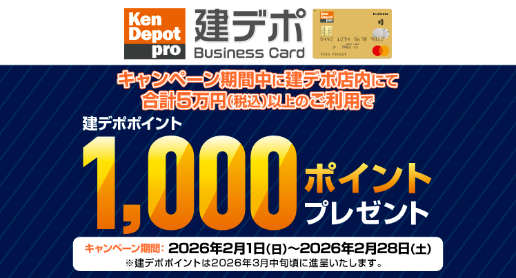 期間中に建デポ店内にて建デポ Business Cardのクレジット払いで合計5万円(税込)以上お買い物いただくと、もれなく建デポポイントを1,000ポイントプレゼントいたします。 2026年2月1日(日)〜2026年2月28日(土)