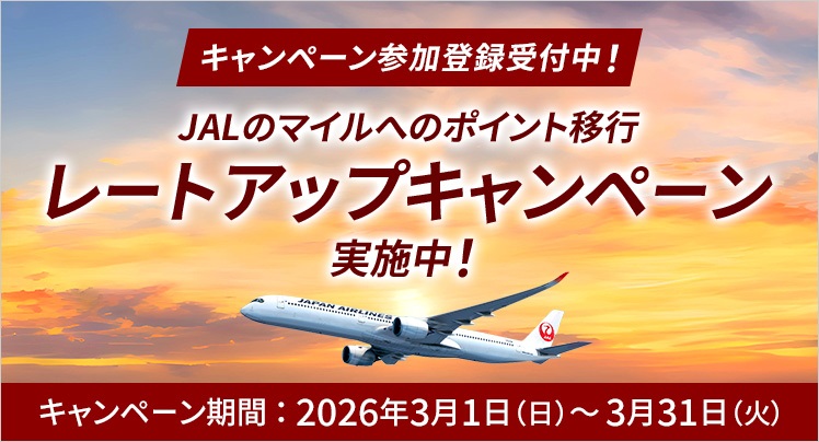 期間中にJALのサイトよりキャンペーンに参加登録のうえ、ポケット・ポイントからマイルへの移行をお申込みいただくと、交換後のマイルの10%レートをアップしたマイル数を積算いたします。 2026年3月1日(日)〜2026年3月31日(火)