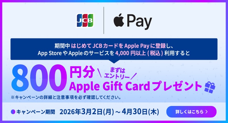 期間中、キャンペーン参加登録のうえ、AppleウォレットにJCBカードを新規登録し、対象のAppleサービスで、合計4,000円(税込)以上利用すると、800円分のApple Gift Cardをプレゼント。 2026年3月2日(月)〜2026年4月30日(木)