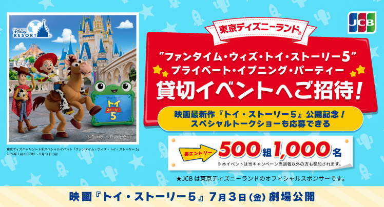 東京ディズニーランド®で開催される“ファンタイム・ウィズ・トイ・ストーリー5” プライベート・イブニング・パーティーへ、500組1,000名様をご招待!アップロードされたレシート(クレジット売上票)の合計金額5,000円(税込)を1口として抽選します。 2026年4月16日(木)〜2026年5月15日(金)