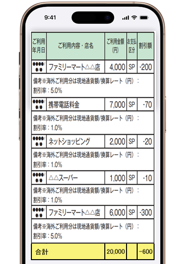 - 割引はカードご利用代金の請求時に適用されます。割引金額はレシートに表示されません。