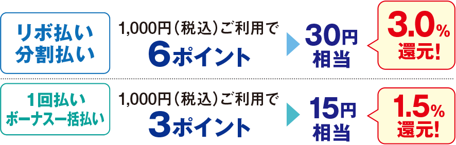 - ボーナス払いはご請求月に、リボ・分割払いは初回ご請求時にポイントが加算されます。