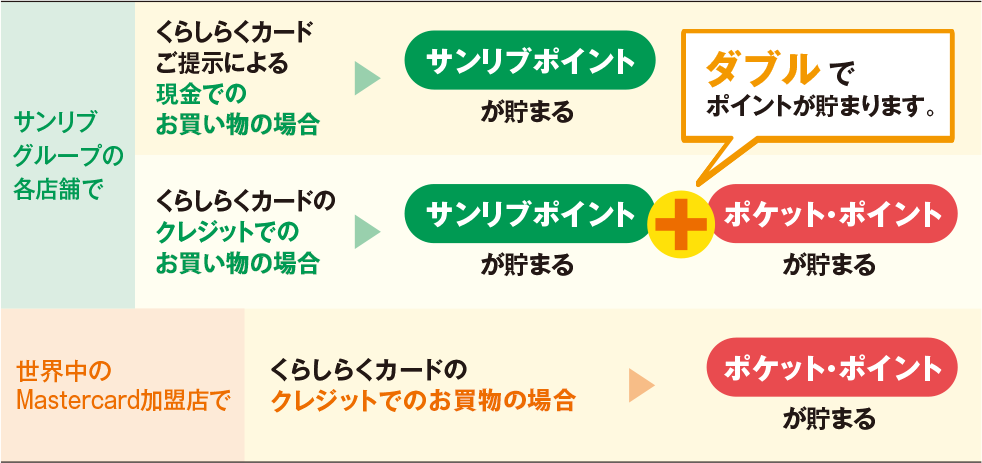 サンリブグループの各店舗で、くらしらくカードのご提示、またはくらしらくカードでお支払いいただくと、200円(税抜き)ごとに1ポイントを進呈。